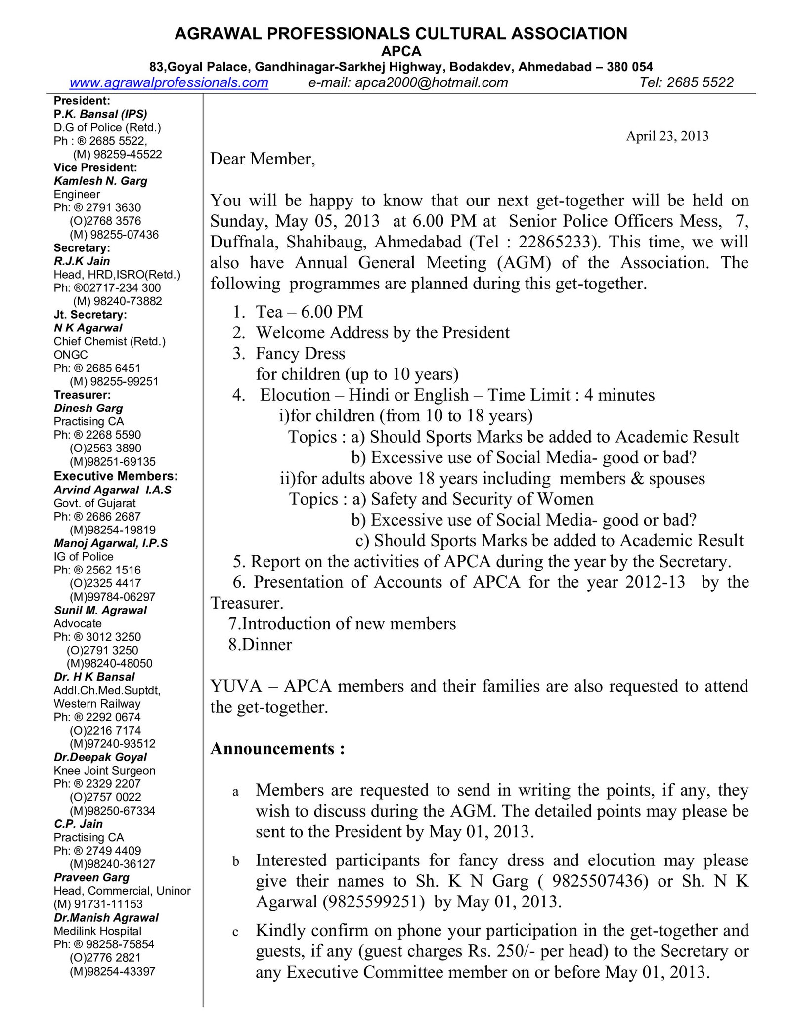 You will be happy to know that our next get-together will be held on Sunday, May 05, 2013 at 6.00 PM at Senior Police Officers Mess, 7, Duffnala, Shahibaug, Ahmedabad (Tel: 22865233). This time, we will also have Annual General Meeting (AGM) of the Association. The following programmes are planned during this get-together.