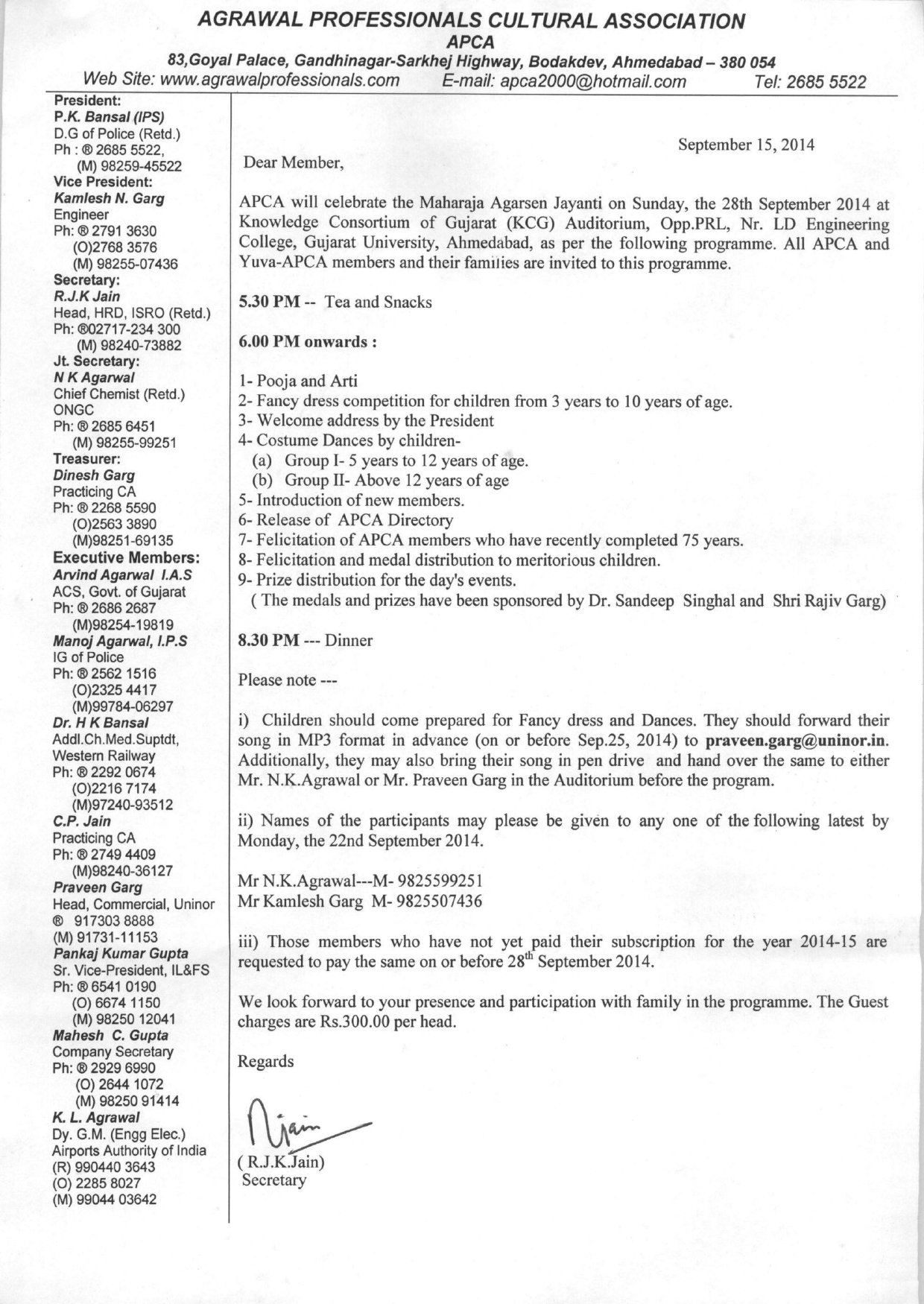 APCA will celebrate the Maharaja Agarsen Jayanti on Sunday, the 28th September 2014 at Knowledge Consortium of Gujarat (KCG) Auditorium, Opp.PRL, Nr. LD Engineering College, Gujarat University, Ahmedabad, as per the following programme. All APCA and Yuva-APCA members and their families are invited to this programme.